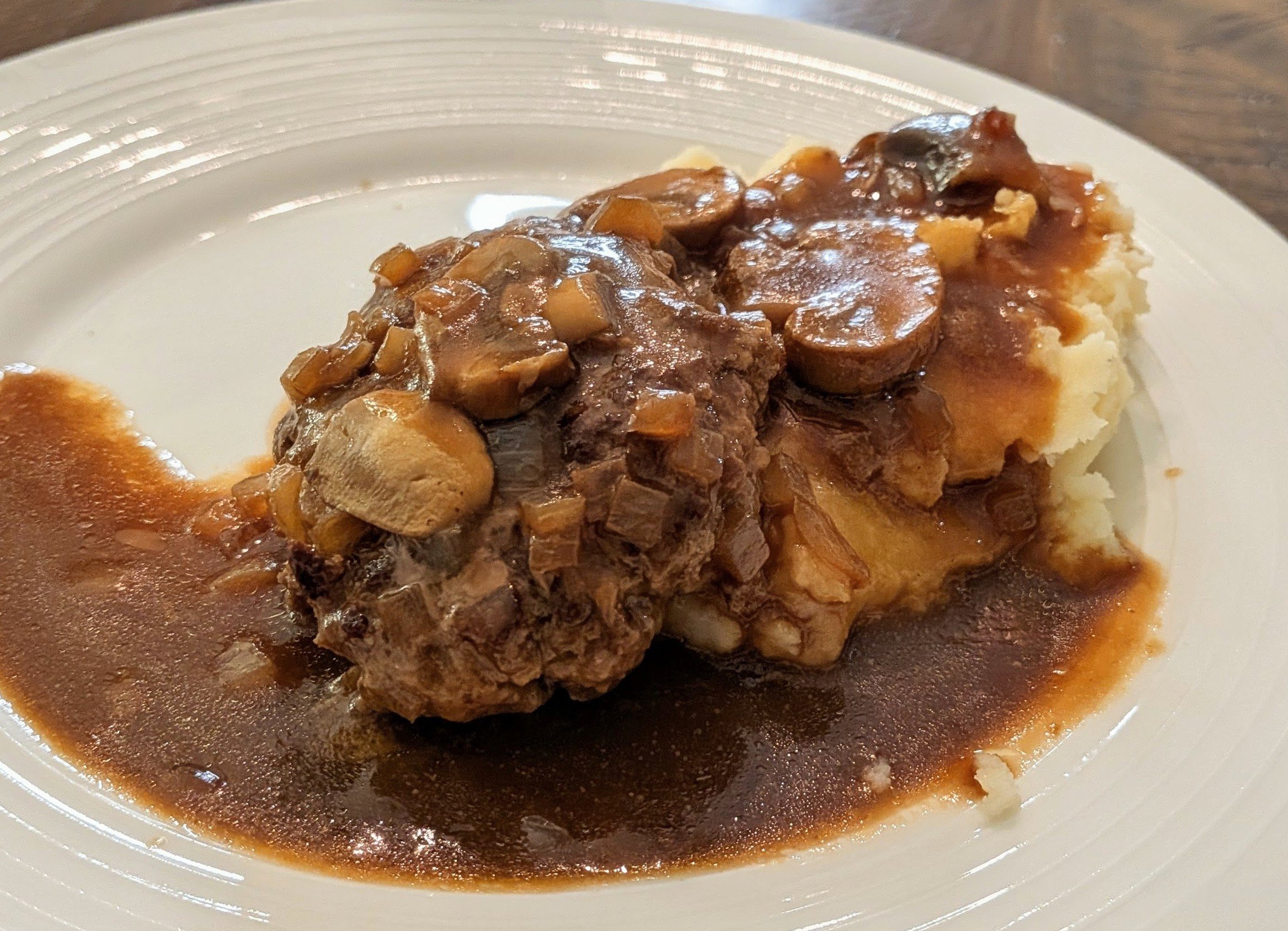 Place the “steaks” back into the pan and turn to med-low. Spoon gravy over the steaks and then place a lid on the pan.